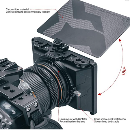 Compact & Lightweight. Integral Design. The Mini Matte Box weighs only 140g (4.9oz). 180° adjustable top flag. Filters can be installed in front or behind the matte box. Easily change the configuration based on your needs.